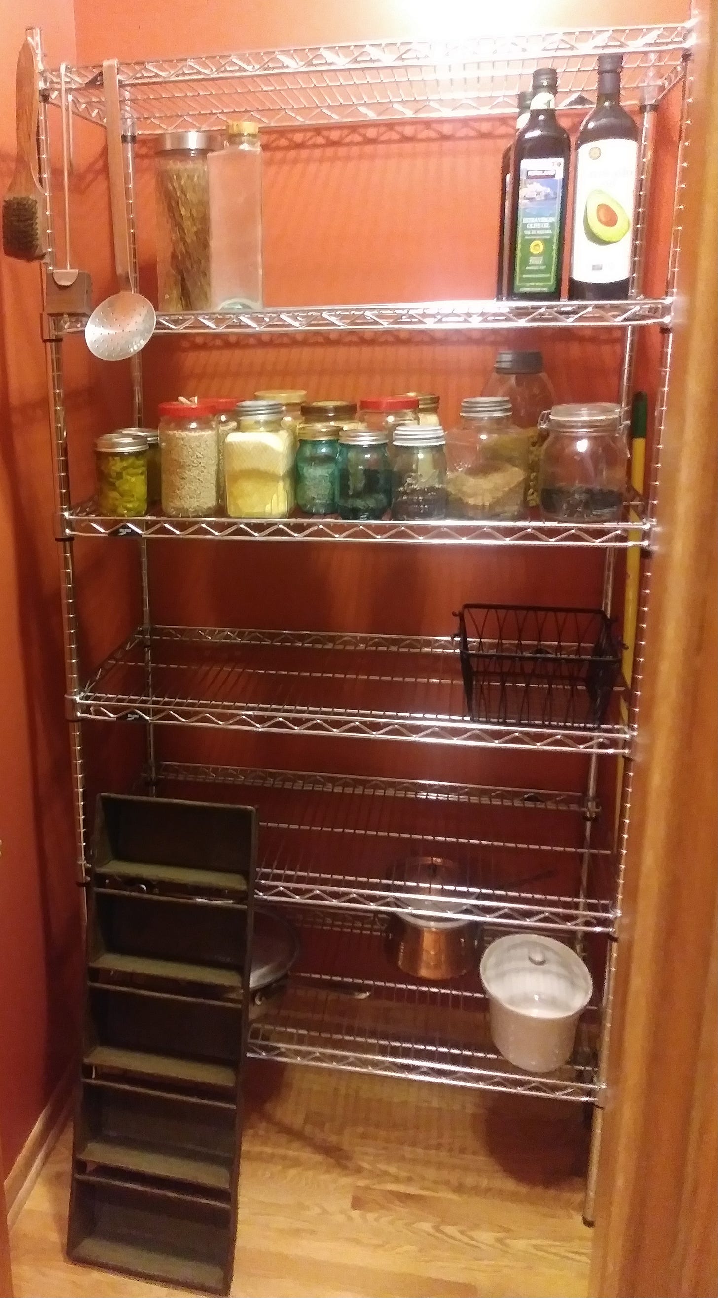 There’s elbow grease & patience required to make your own pantry staples—that broth I hope you made after Thanksgiving qualifies, waiting in the freezer for the next feast or winter soup. But you may be lucky enough to be gifted the creative efforts of other makers. A jar of Armagnac plum jam, a bottle of herb & garlic (or my mom’s favorite cranberry-rosemary) vinegar, some vibrant elderberry syrup to splash into cocktails, or a lavender-infused liquor. But your pantry can be just the basics—cans of cooked beans and tomatoes, canisters of rices and other grains, bottles of good oils. Or more exotic items found in global markets, usually grabbed to make a new recipe. A pantry can explode like a family of rabbits (how many jars of mustard do you need?) My own pantry shelves hold stacks of dry goods, in very cozy style, that I need to cull periodically.