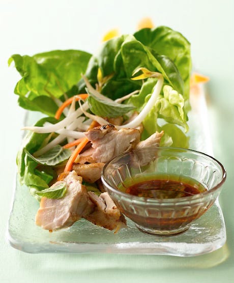 6. To serve, spoon the chicken-mushroom mixture into a bowl. Arrange the lettuce leaves on a plate or tray with the dish of dipping sauce. Each person can spoon some of the chicken and mushrooms into a lettuce leaf, topped with some cilantro, a squeeze of lime, and a spoonful of sauce.