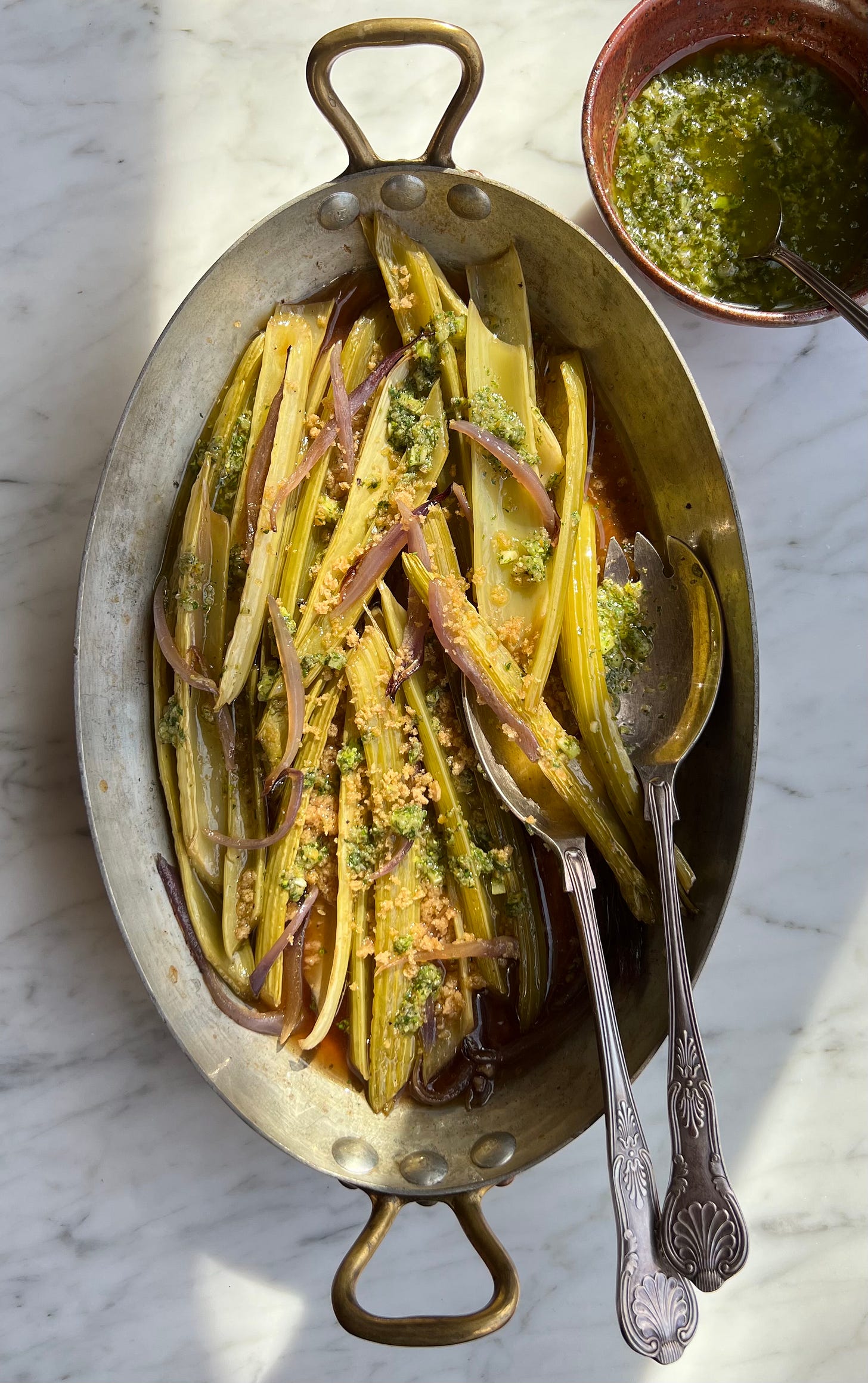 Here you go—a riff on a classic oven braise, adapted from something I vaguely recall making in cooking school. But I’m jazzing it up with a green herbal sauce that’s a little crunchy with celery. Spoon the sauce leftovers on whatever you like & switch up the herbs you use as more choices show up in your garden or farmers market (try some lovage, a leafy perennial that’s a kissing cousin to parsley. It’s citrusy & intense celery-like flavor would be great.) Soon asparagus, artichokes, and loads of other showy spring greens will nudge over steady Eddy veg like celery—don’t forget to give it a little love!